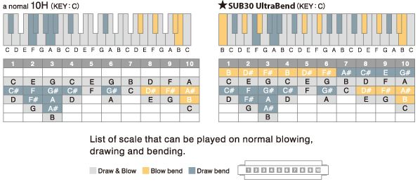| Suzuki SUB30 UltraBend w/an extra Sympathetic Reed in each hole, one tone below the pitch of the lowest note, allowing a full chromatic scale using standard bending techniques. Diagram. Available in C, G and A. | $169.99 |